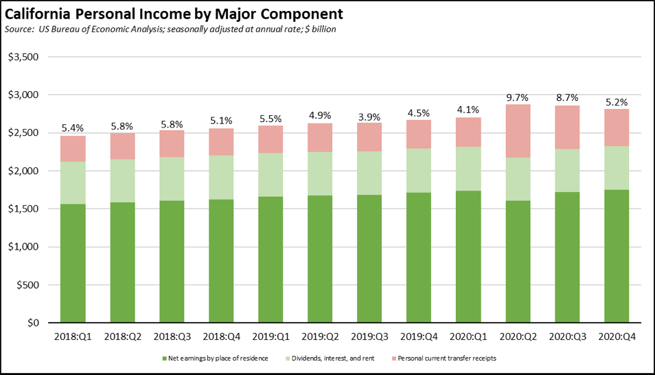 Second, the increase in federal transfer payments—in particular higher and new unemployment benefits and the tax credit payments along with other higher benefits in the various COVID bills—pushed income growth well above prior years in the 2nd and 3rd quarters, with total personal income ending the year at a 5.2% growth. The effects of government transfer payments, however, was more distributional, accruing heavily to the lower-wage households most affected by the state’s pandemic strategies.
