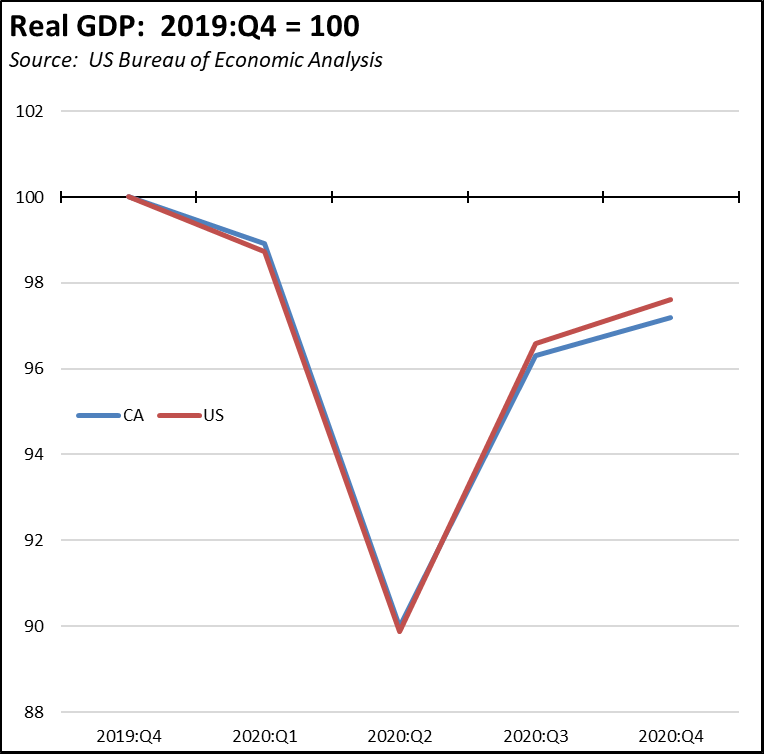 A similar release on 2020 real GDP indicates substantial progress towards but not yet full recovery for the state and the nation. Measured by change from the last quarter in 2019, relative changes in both the state and the US numbers tracked closely in the first three quarters of 2020. Some divergence than occurred in the 4th quarter, with California down 2.8% compared to the same period in 2019, and the nation as a whole down 2.4%. Compared to the other states, California ranked 15th for real GDP growth over the year, but 32nd for growth in the 4th quarter.
