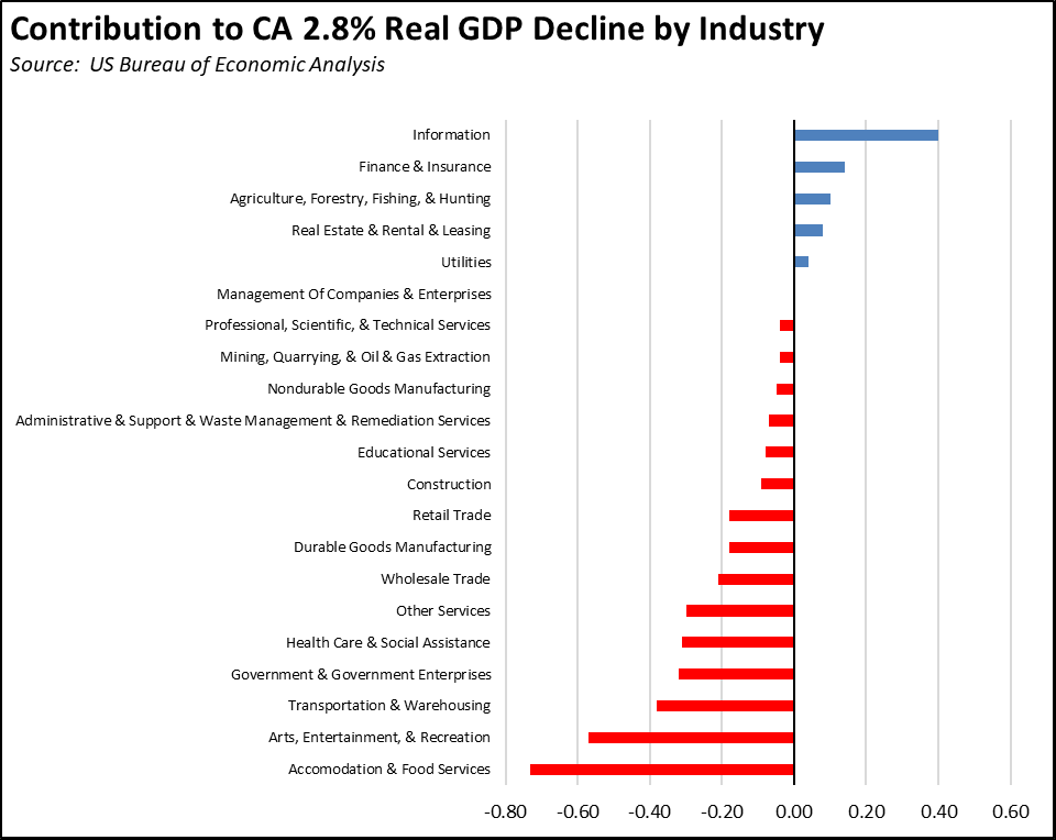 Overall, four industries produced a positive contribution to the state’s real GDP in 2020 (e.g., Information had a positive contribution of 0.40 percentage point to the overall 2.8% decline), with the highest contractions coming from two industries hit hardest by the state’s pandemic strategies—Accommodation & Food Services and Arts, Entertainment & Recreation—along with Transportation & Warehousing which was affected substantially by the early disruptions to trade and continued lower levels of exports.