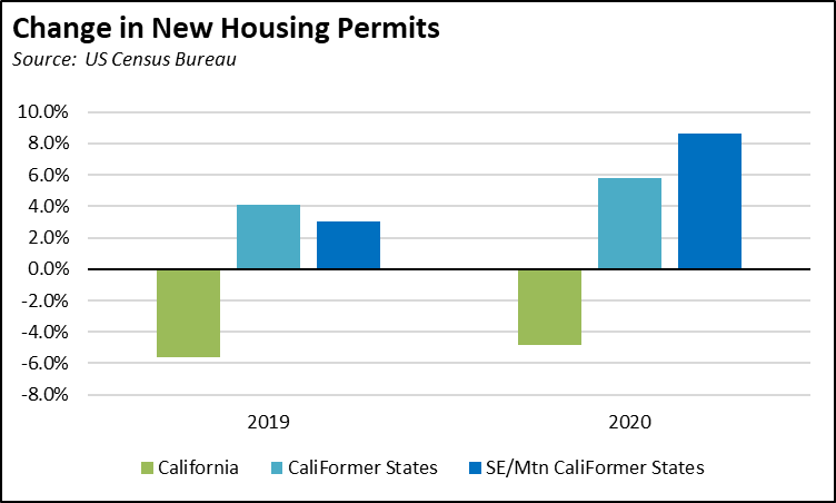 The CaliFormer destination states in contrast are expanding housing supply more quickly even during the 2020 pandemic year. Comparing Census Bureau data, new permits grew 5.8% in 2020 within all the CaliFormer destination states discussed in our report on the January jobs releases. Looking just at the Southeastern and Mountain destination states, permits were up 8.6%.