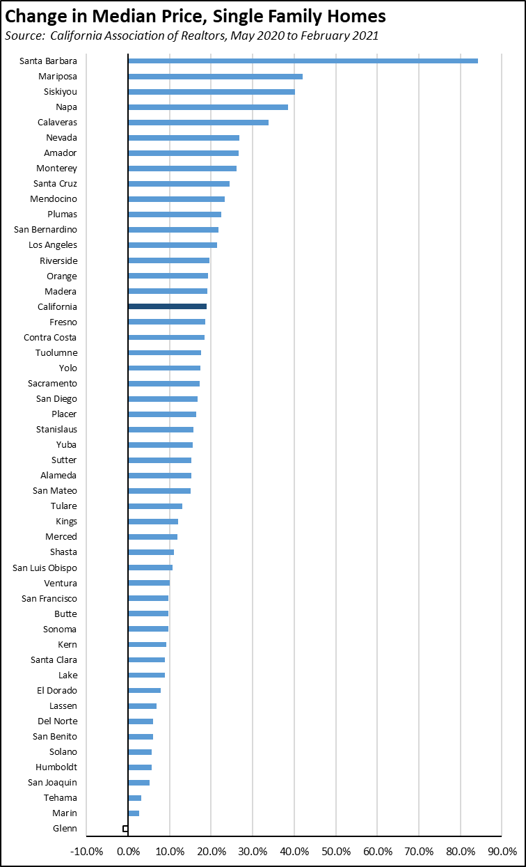 This continuing supply shortfall in California combined with the new sources of demand coming from workers leaving the Bay Area—especially for larger homes with office space for telecommuting workers and quiet space for distance learning students—has put upward pressure on prices. In the most recent data from California Association of Realtors for February, median price for existing single family homes grew 18.9% compared to the pandemic-period low in May. The outcomes ranged from a small price drop in Glenn County to an 84.2% rise in Santa Barbara (Mono at 175% is treated as an outlier and is not included in the graph). For comparison, the median price in pre-pandemic 2019 grew only 10.3% for the state.