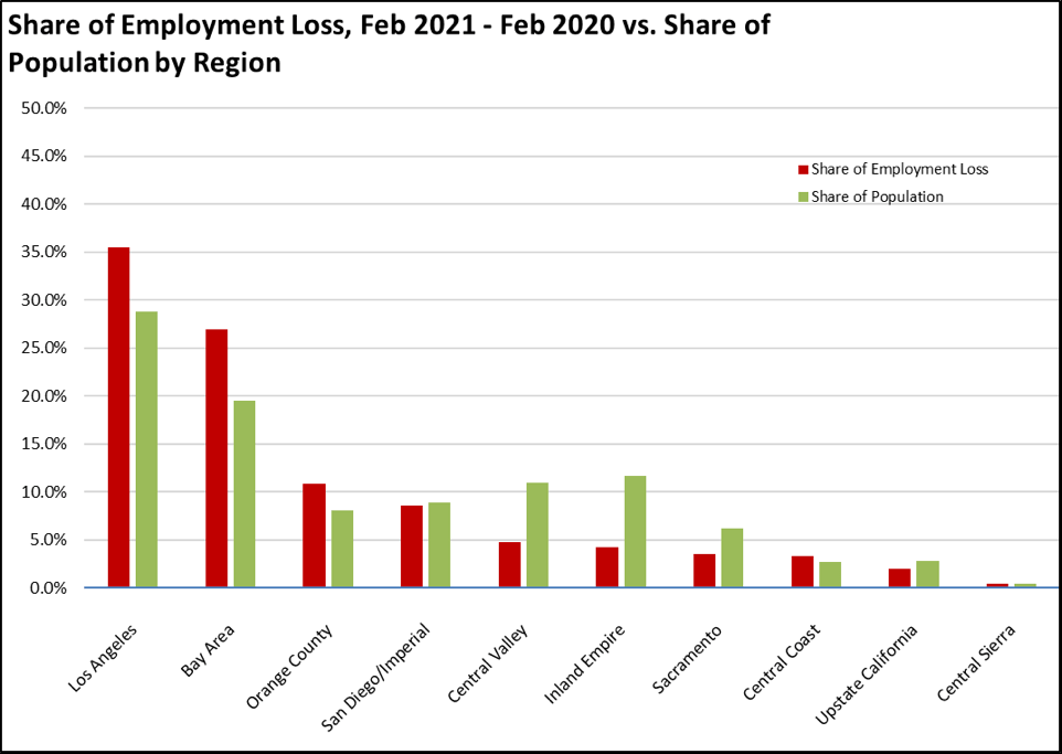 Compared to the February 2020 numbers (seasonally adjusted) just prior to the current crisis and not accounting for population changes, nonfarm wage and salary jobs in California dropped to 1.662 million short of recovery.