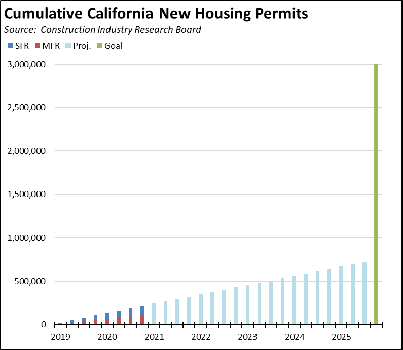 The continuing cause of rising housing costs—now being experienced even during a severe recession—is lack of supply. In the most recent results from the Construction Industry Research Board, total new housing permits reached only 104,554 in 2020, or less than half of what is required simply to maintain pace with population growth. The 2020 results were also little changed from the prior years, down only 5% from the 2019 level, which in turn was down 6% from the total in 2018. At the current trend, the cumulative total of new housing permits would reach only 750,000 by the end of 2025, or only a quarter of the governor’s goal of 3 million new units.