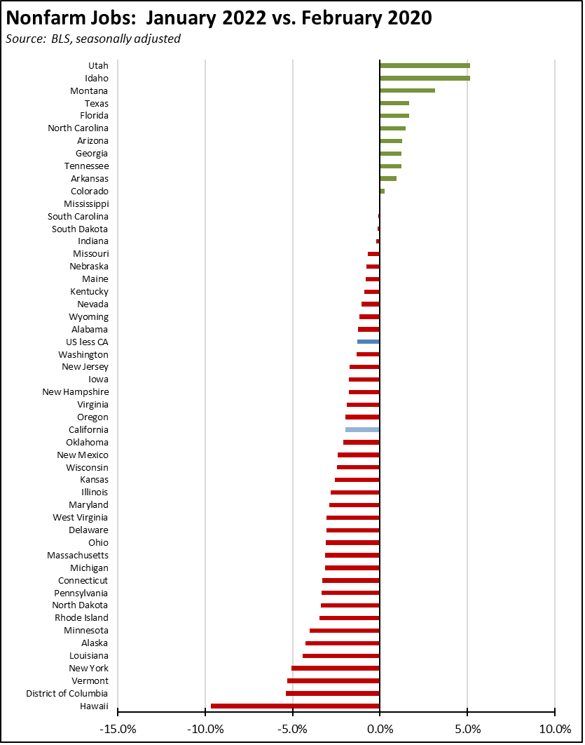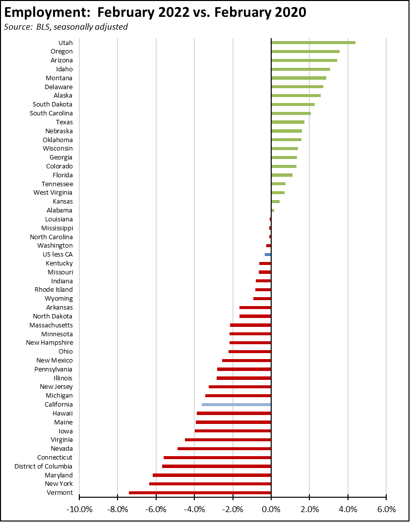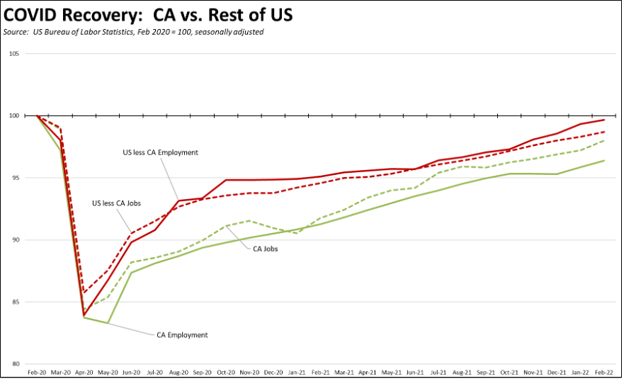The employment lags remain more significant. California accounts for 22% of the states still showing an employment gap, while 20 states again showed more people working than before the pandemic. The state’s unemployment rate of 5.4%, while improving, remained the 3rd highest in the nation in a tie with Alaska; 22 states had unemployment rates at or below the February 2020 level.