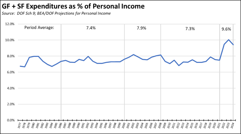 Borrowing and expanding on a previous analysis by LAO, overall state expenditures—even incorporating LAO’s lower revenue estimate and recommended spending reductions—are still running not just above but well above historic levels. Total state expenditures (general and special funds) were relatively steady in the period prior to the current surplus conditions, averaging 7.9% of state personal income in the period FY 2000 to FY 2008 just prior to the Great Recession, and 7.3% in the period FY 2009 to the beginning of the pandemic period in FY 2021.
