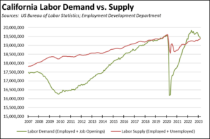 California has just gone through a period when much stronger jobs creation was possible, but state policies that emphasize benefits over earned income combined with high costs of living that encourage workers to move to other states rather than moving here dampened those prospects. Should the trends shown in the chart continue, the shift from excess demand (employed plus unfilled job openings) to excess supply (employed plus unemployed) also has ramifications for additional wage growth in the upcoming period.