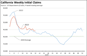Measured on a four-week moving average, initial unemployment insurance claims essentially dropped back to their 2022 level for the week ending May 13 as seasonal hiring picked up. The overall reliance on this program, however, remains strongly elevated in California. While this state represents 11.6% of the US as measured by nonfarm jobs, initial claims for the week ending May 13 were 19.7% of the total, and insured unemployment—a proxy for continuing claims—were more than double the state’s share at 24.8% of the total as of the week ending May 6.