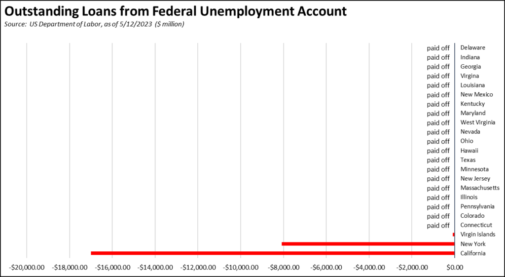 With the recent action by Connecticut, California and New York are now the only two states with a substantial debt being carried over from the pandemic period. The others have paid off these loans including most using the federal pandemic assistance funds that were allocated for this purpose. Most of these states, including Connecticut, also used these actions to restore the fiscal health of their state funds while reducing tax rates on employers.