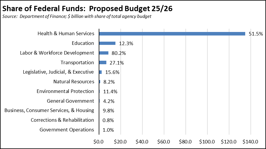 - Federal funds are expected to support 34.6% of total expenditures contained in the governor’s Proposed Budget for 2025/26. The expected $170.6 billion federal funds are distributed across the various agencies as shown in the following chart, ranging up to 80.2% of total expenditures for Labor & Workforce Development and 51.5% for Health & Human Services. The HHS component in particular is a key source of the state’s current job growth, supporting the Healthcare jobs component as well as the minimum wage, part-time, and limited term In-Home & Supportive Services (IHSS) jobs that make up a major share of the state’s jobs growth. This chart does not include the $21 billion and growing Unemployment Insurance Fund debt to the federal government.