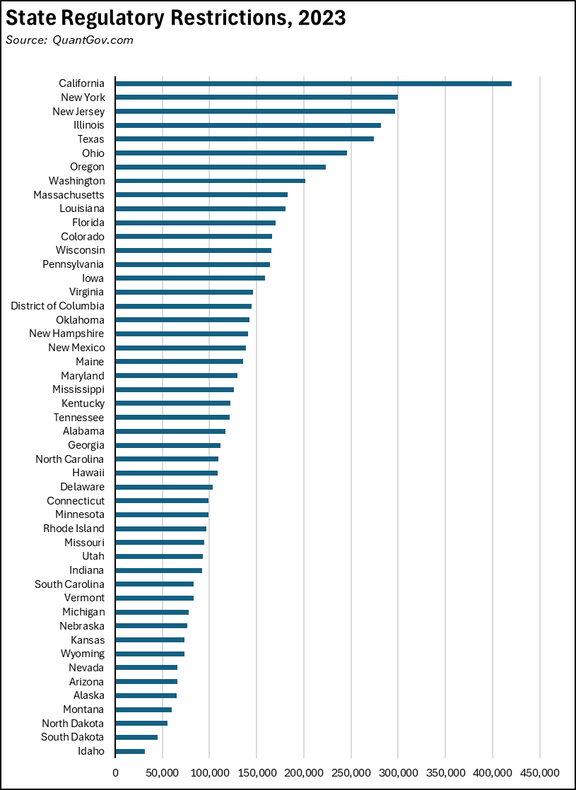 - As federal regulations are reformed under current efforts, differences in state regulatory burdens will become more apparent and likely to become more significant in overall capital and job investments. On this basis, California’s burden is not just higher, it is substantially higher than any other state. Putting aside the 11 states that have already launched their own DOGE efforts to increase their competitiveness, QuantGov.com provides a quantitative comparison tracking state regulatory restrictions by year. In the most current data for 2023, California led with 420,434 regulatory restrictions, while second place New York had 300,095 and lowest rated Idaho had only 31,497. The chart below covers only state regulations. California is also fairly unique in its proliferation of regulatory authorities across a multitude of regional and local authorities.