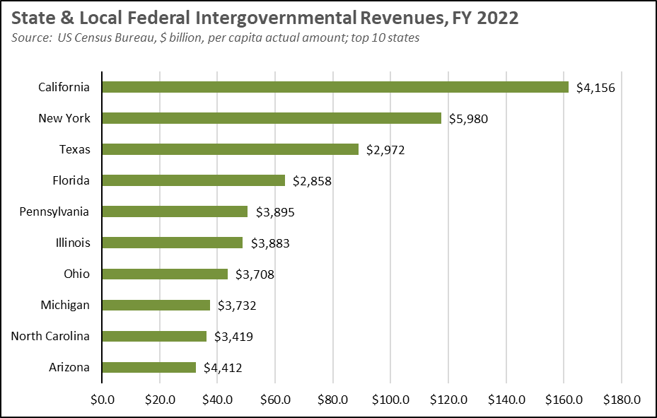 - Using the most current data from US Census Bureau, California state and local budgets received $161.7 billion in intergovernmental revenues from the federal government in FY 2022, the highest of any state. California received 12.9% of all federal funding, above its population share that year of 11.7%. On a per capita basis, California’s $4,156 was 18th highest among the states and DC, and well above the leading job creating states Texas ($2,972), Florida ($2,858), and North Carolina ($3,419).