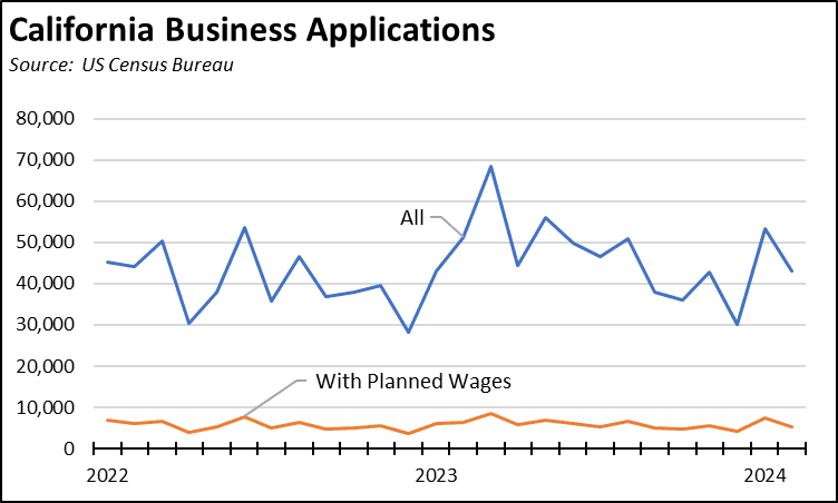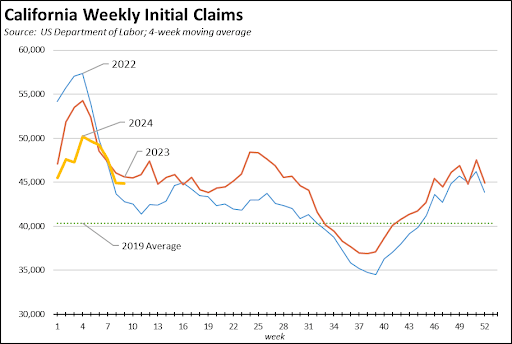 After a more promising start at the beginning of the year—reflecting the January job results—initial claims for unemployment insurance in recent weeks have begun to track the relatively higher trend at the beginning of 2023. As an indicator, initial claims consequently have yet to show much movement away from the recessionary conditions California experienced in 2022 and the first half of 2023.