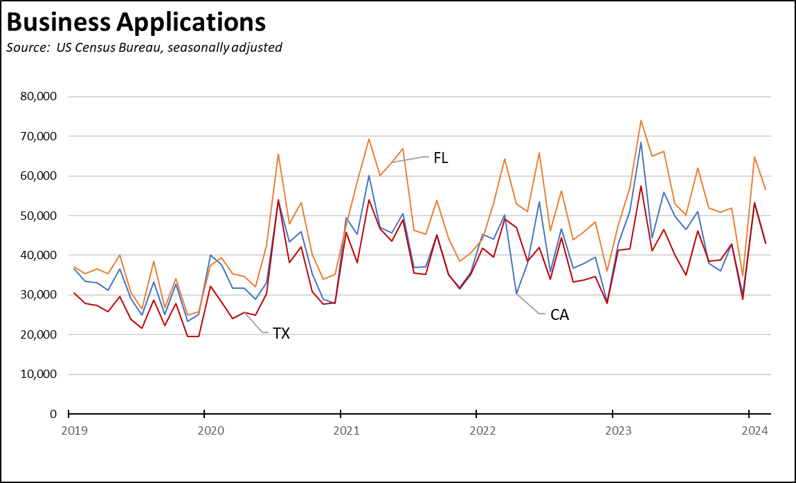 California formation activity also continues to show few differences with those in Florida and Texas. New Florida business formations have outpaced California in most months. The differences between California and Texas, except for the fact that Texas is a smaller state for now, are few.