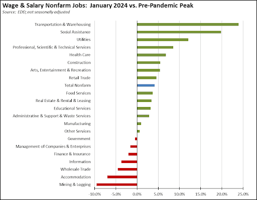 Using the not seasonally adjusted series to show more detail, job growth since the pre-pandemic peak remains concentrated in blue-collar middle class wage Transportation & Warehousing, lower-wage government supported Social Assistance, and higher wage Utilities and Professional, Scientific & Technical Services. Mining & Logging moves into last place, reflecting the success of state policies designed to eliminate a substantial portion of these higher wage blue-collar jobs.