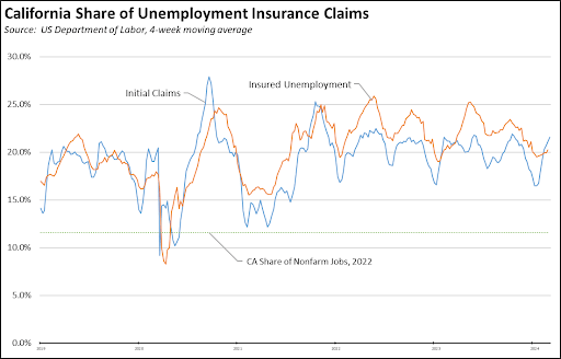 Unemployment insurance claims also remain well above the state’s share of total employment, stemming both from overall job conditions as well as the relatively more generous administration of these benefits under current state law. In the most recent 4-week moving averages, California accounted for 21.6% of all initial claims in the US, and 20.2% of all insured unemployment, a proxy for continuing claims.