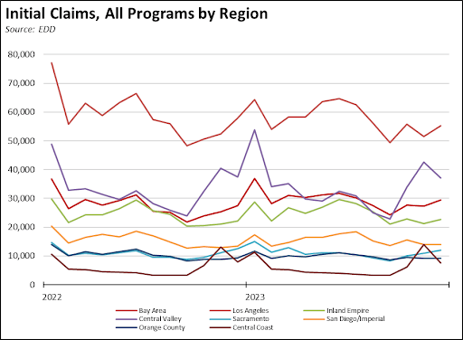 By region, the largest increases in claims during the last quarter of 2023 were: Central Coast (137.2%), Central Valley (62.3%), Sacramento (44.2%), and Bay Area (20.2%).