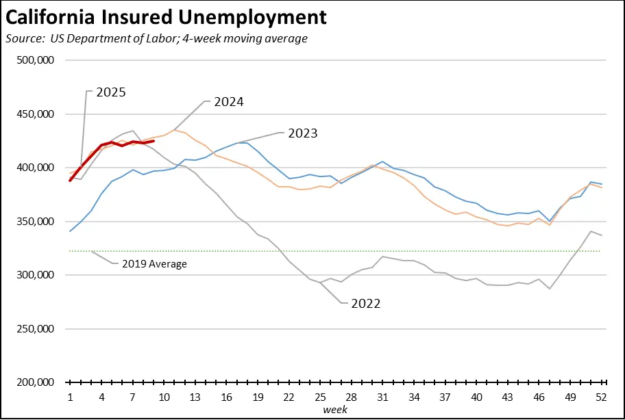 The number of workers receiving unemployment—as measured by insured unemployed (a proxy for continuing claims)—also is tracking near the 2024 levels. Overall, insured unemployed remains well above historic levels.