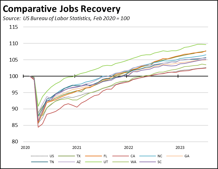 Comparing net jobs creation since the pre-pandemic high, California again came in third at 443,500, behind Texas at 997,800 and Florida at 704,00. Using the relative growth rate to compare states, California remained in 21st place and essentially matched the national average. The chart below compares the net jobs rate for the 10 states with the largest jobs growth in absolute numbers. The faster growth particularly in the Southeastern states illustrates the shifting economic center for the nation, combining pandemic era actions that promoted quicker recovery along with policies since then that have facilitated faster jobs growth.