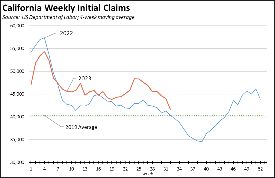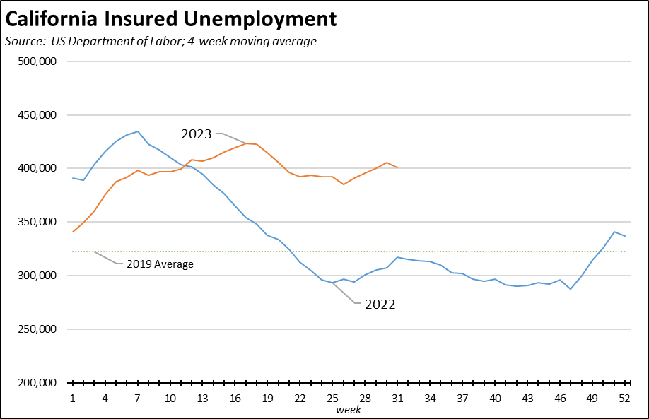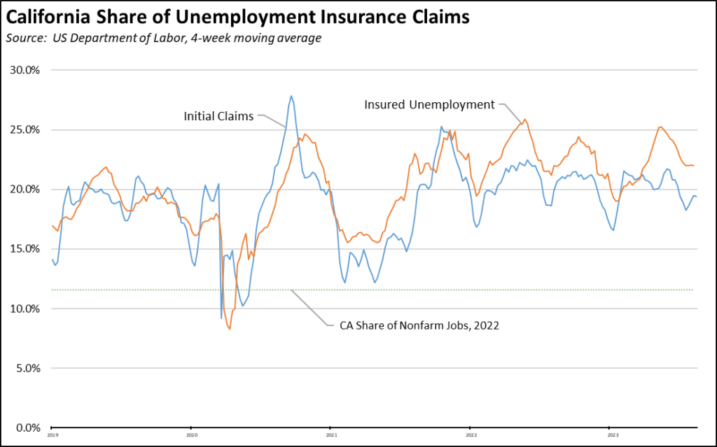 But while initial claims have eased in the latest results, the program overall as it is administered in California covers a much larger share of the labor force than nationally. In the latest results (4-week moving averages), California produced 19.4% of all initial claims and 22.0% of insured unemployment. In contrast, California contained only 11.6% of all nonfarm jobs.