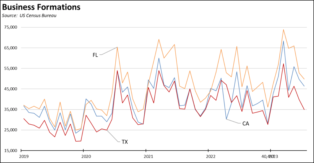 After peaking in March, new Business Formations as tracked by US Census Bureau have declined but in the latest data for July still remain above the average for 2022. Business Formations in Florida continue to surpass California in every month since January 2022. After essentially tracking California beginning in the second half of 2020, Business Formations in Texas have slowed more in the most recent months.