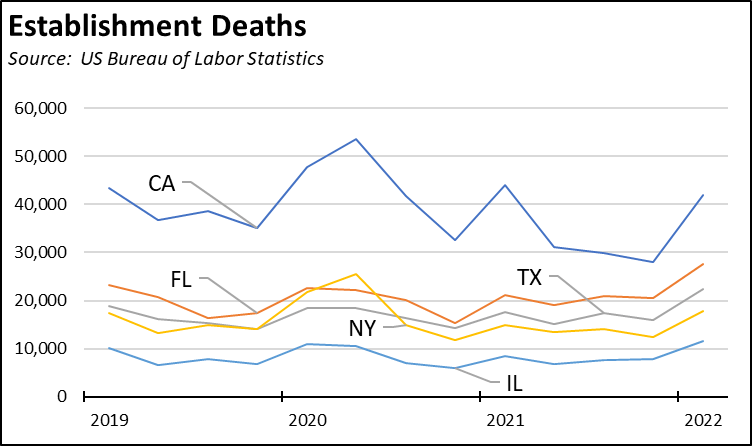 On the flip side, California because of its size also continues to lead in the number of establishment deaths. Note that the establishment death data lags by an additional 3 quarters and is only currently available through the first quarter of 2022.
