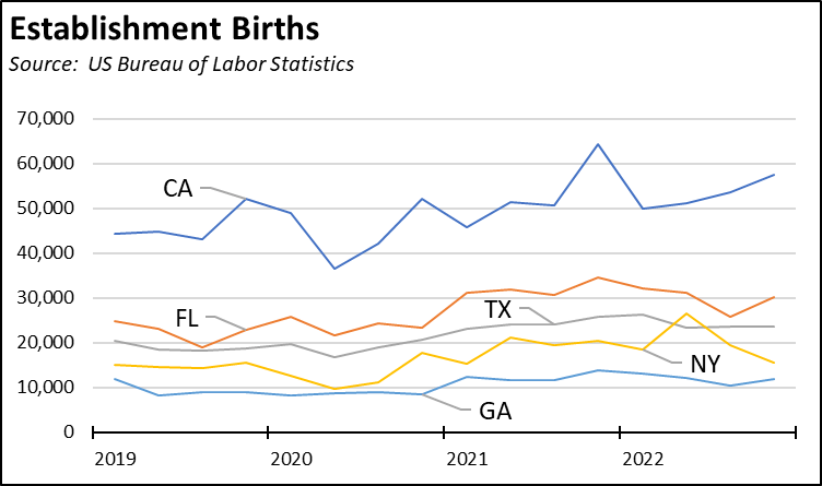 In the Business Employment Dynamics series from US Department of Bureau of Labor Statistics, California continues to lead in the number of establishment births (a firm may have one or more establishments at the same or multiple addresses).