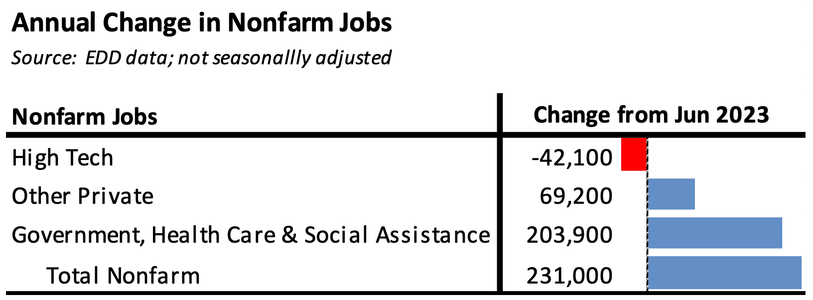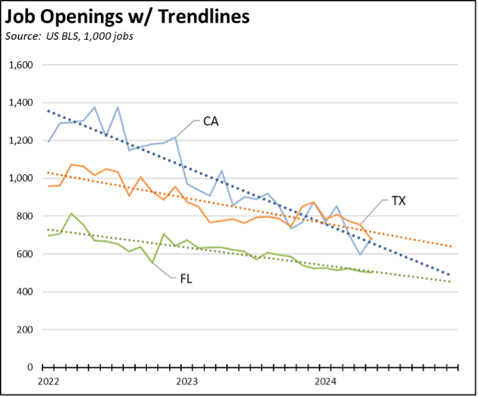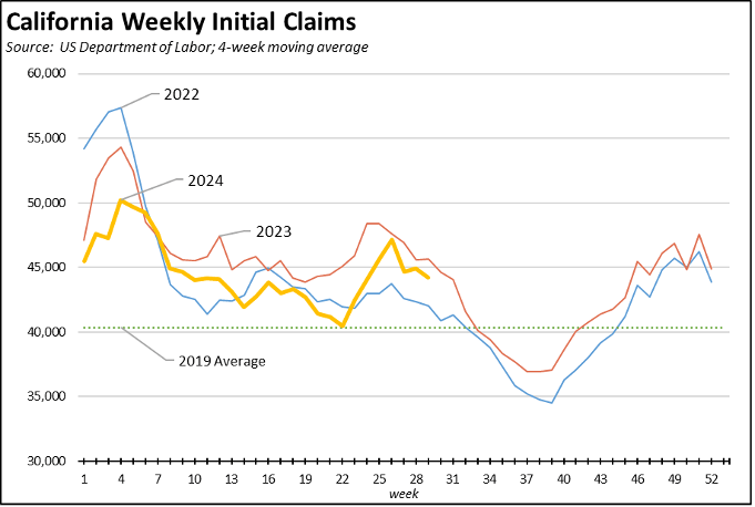 This weakness is also reflected in the overall trend for unfilled job openings in the JOLTS (Job Openings & Labor Turnover Survey) data for the state. Although the recent results for May show improvement from the prior month, the current trend shows a steady deterioration as California employers have cut back on their hiring plans. Even at its improved level, the results for May were 10% below the pre-pandemic average in 2019. In contrast, Texas has been showing job openings near or above California since last fall. At the current trends, even Florida would surpass the state by the beginning of next year.