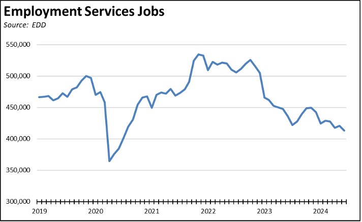 In yet another sign of softening in the labor numbers, businesses are also pulling back on temporary workers in the state just as they are on the national level. EDD does not include the Temporary Help Services industry in its monthly estimates, but instead includes these jobs in the slightly broader Employment Services. Temporary Help Services, however, is the substantial component of this broader industry, accounting for about 90% of the change in the job levels.