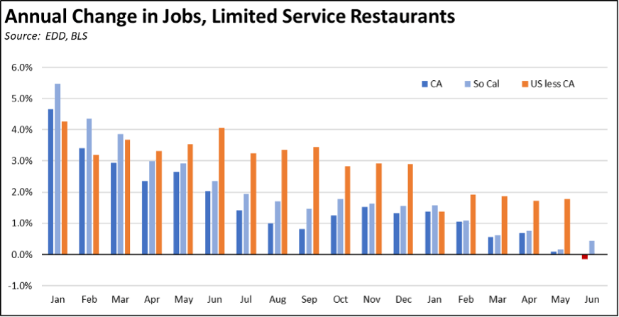 As a result, the jobs effect shown above for limited-service companies is being amplified in the comparable results for the broader restaurant industry. Restaurant jobs growth in the state has been near or below zero for the past 5 months while continuing to grow in the rest of the US.