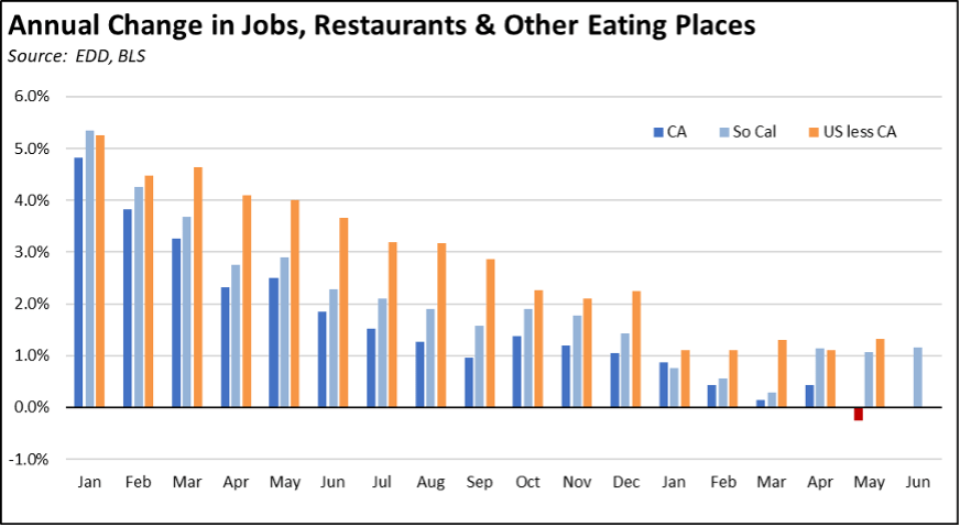 Taking a broader look at the data, hiring in this industry—both Southern California and the state—slowed markedly in the months leading up to the effective data for the new wage and basically collapsed after that. This outcome is especially evident when compared to the industry jobs trend in the rest of the country. Jobs growth in the first half of 2023 closely matched or grew faster than the rest of the country. Jobs growth in the first half of 2024 instead has fallen dramatically behind, with industry jobs for the state down 1,100 (-0.1%) in June. Note that the US industry data for June is not yet available.