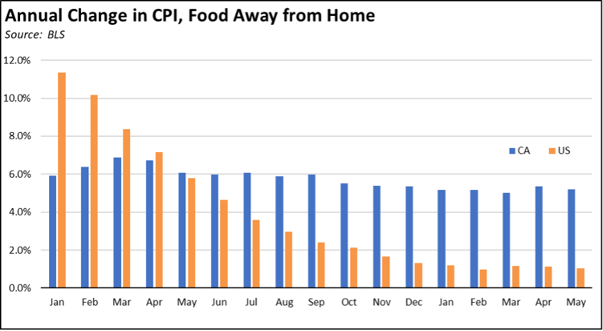 And while restaurant jobs have stalled and declined, the associated costs are being passed on to consumers. Applying the same formula Department of Finance uses to calculate the California CPI, inflation related to the Food Away from Home component (restaurants and take out) has largely abated in the country as whole. In contrast, restaurant prices are rising more than 5 times faster in California.