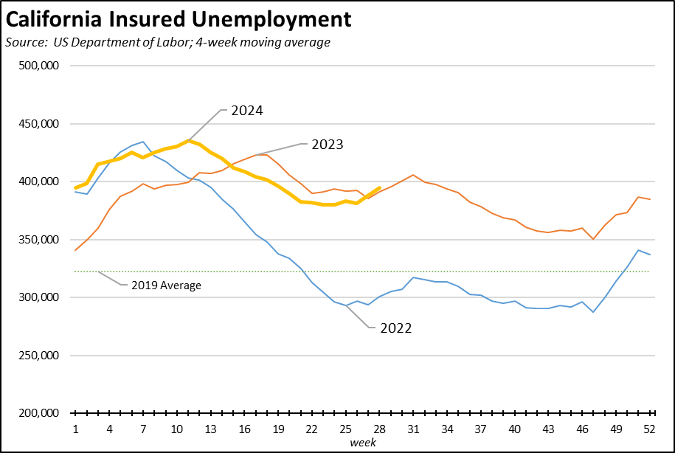 The number of workers receiving unemployment—as measured by insured unemployed (a proxy for continuing claims)—has just poked above the 2023 numbers during this period, remaining substantially elevated above the levels in 2022.