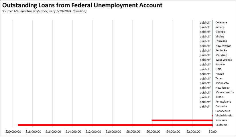 Yet in spite of the importance of this program made even more so by increasing unemployment in California, the state fund continues to sink further into functional bankruptcy. California continues to be one of only two states still carrying a UI Fund debt over from the Pandemic, substantially so in the state’s case. And as indicated in our report last month, the most recent forecast released by Employment Development Department expects the program to pay out 42% more ($2.018 billion) than what it will take in from the Employer Contributions in fiscal year 2024, and 30% more ($1.554 billion) than what it will take in in fiscal year 2025. These forecasts assume no new economic slowdown in this period.
