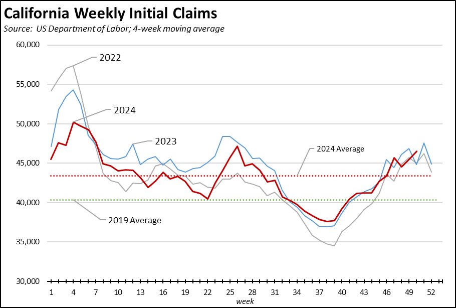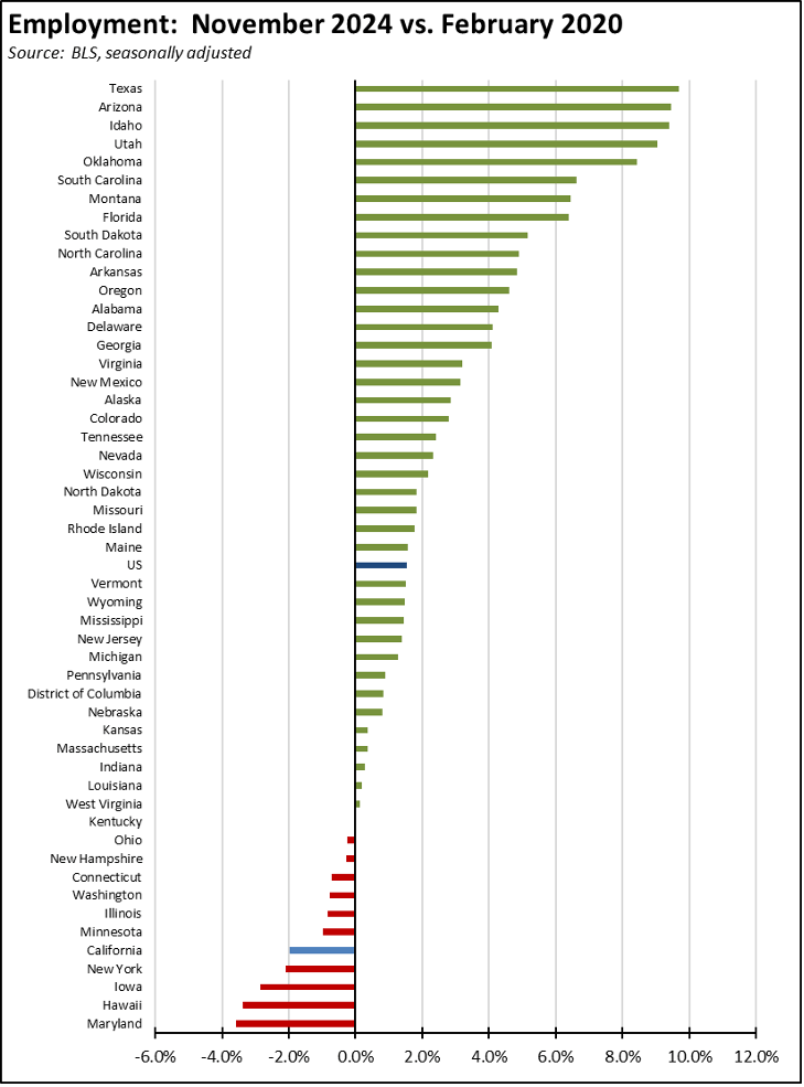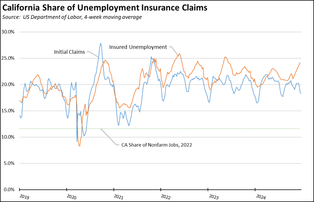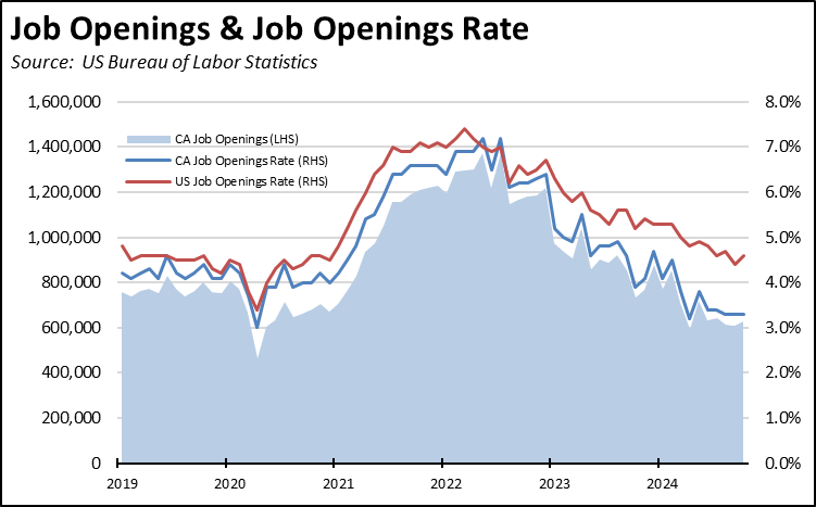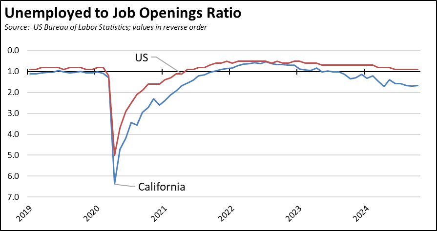 The state’s substantially slower jobs performance is also reflected in its growing unemployment. The November unemployment rate of 5.4% while unchanged from October was also unchanged from being the 2nd highest among the states. The total number of unemployed also continued to grow, with unemployment now exceeding 1 million each month so far in 2024. While stabilizing, the jobs growth potential as indicated by unfilled job openings at the end of each month remains far below the level required to cut into the growing number of unemployed workers, with California by far the worst among the states at 1.7 unemployed workers vying for every job opening.