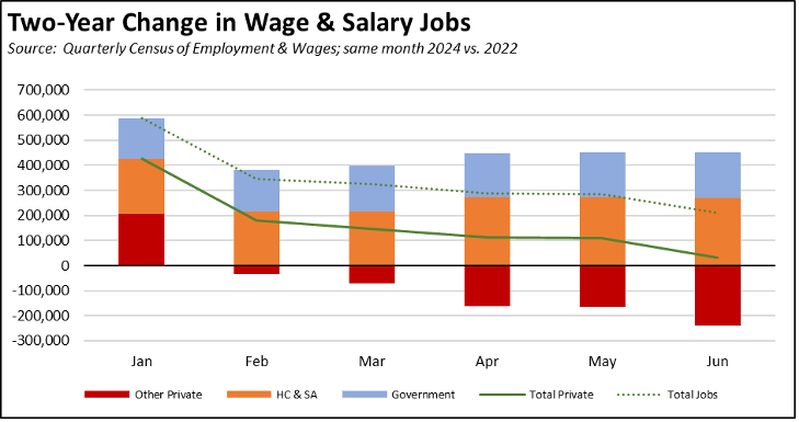 Using the last method, a different but far more accurate picture emerges from the data. Comparing each month to date in 2024 with the corresponding month in 2022, total private jobs have been slowing throughout 2024, and by June showed a growth of only 31,121 over the two-year period.