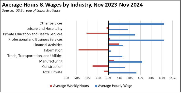 Over the 12 months ending November 2024, average hourly wage in all private industries saw growth of 5.2%. Only a portion of these gains were offset as average weekly hours worked edged down by only 0.9%.