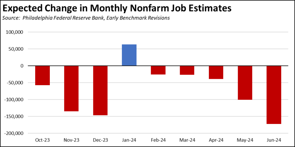 Factoring in the 2024 Q2 results, these early benchmark numbers based on the QCEW indicate that instead of growing by 79,800 (seasonally adjusted) between January and June, nonfarm jobs contracted by 156,400. Expected changes in nonfarm numbers for the early benchmark period are shown in the chart. Note that this number is substantially more than the preliminary revision expectations announced by US Bureau of Labor Statistics for March. Divergence between the monthly modeled estimates and the QCEW counts has grown since then.
