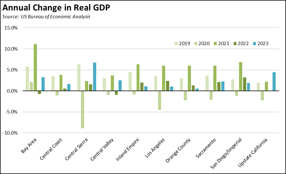 Real GDP growth in 2023 showed expansion from the 2022 levels in 6 out of the 10 regions. Growth was strongest in the smaller primarily rural regions, while the Bay Area—the dominant factor in the state’s overall GDP growth and its budget condition—grew by only 3.3%. Among the other larger urban areas, Los Angeles was far weaker at 1.0%, with San Diego/Imperial at 1.9%, Inland Empire at 1.1%, Orange County at only 0.5%, Sacramento at 2.2%, and Central Valley at 2.5%. Note that Real GDP is calculated separately for each county. The numbers in the chart reflect aggregations for the constituent counties rather than separate estimates for each region.