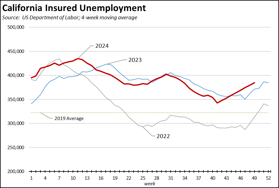 The number of workers receiving unemployment—as measured by insured unemployed (a proxy for continuing claims)—is now tracking somewhat above the 2023 levels, and also remains substantially above the levels in 2022.