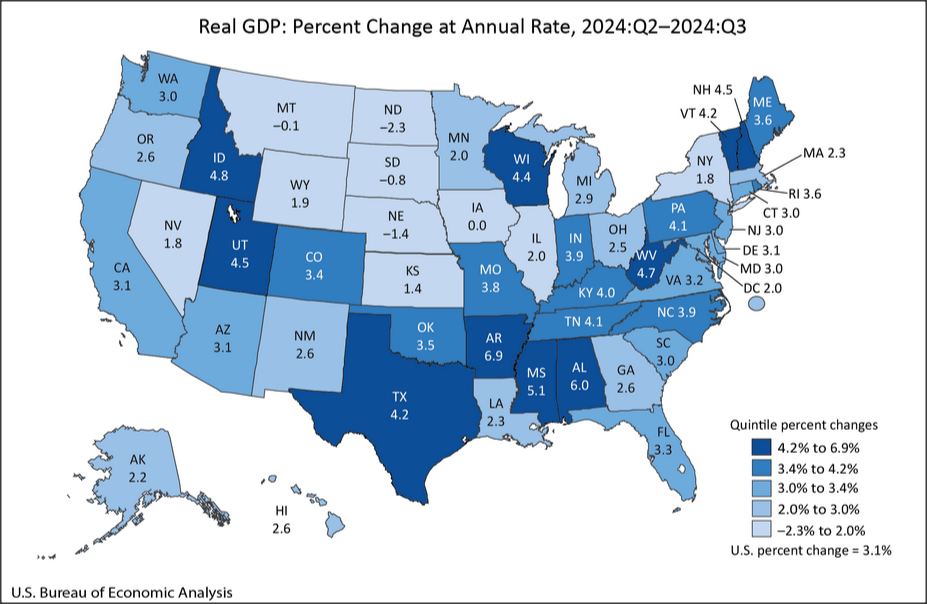 US Bureau of Economic Analysis data shows California’s real GDP grew at an annualized rate of 3.1% in the 3rd Quarter, the 23rd highest among the states but matching the overall national average of 3.1%. This performance was higher than the 2.8% from the 2nd, but down from 6.3% in the 1st Quarter. Over the year (2023 Q3 to 2024 Q3), California grew 3.6%, the 9th highest among the states.