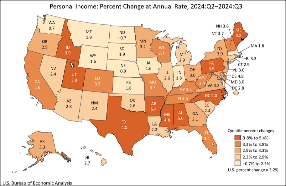 US Bureau of Economic Analysis data shows California’s Personal income grew at an annualized rate of 3.6% in the 3rd Quarter, the 13th highest among the states and above the overall national average of 3.2%. California’s rate moderated substantially from 4.2% in the 2nd Quarter and 14.7% in the 1st Quarter. Over the year (2023 Q3 to 2024 Q3), California grew 6.3%, the 3rd highest among the states.