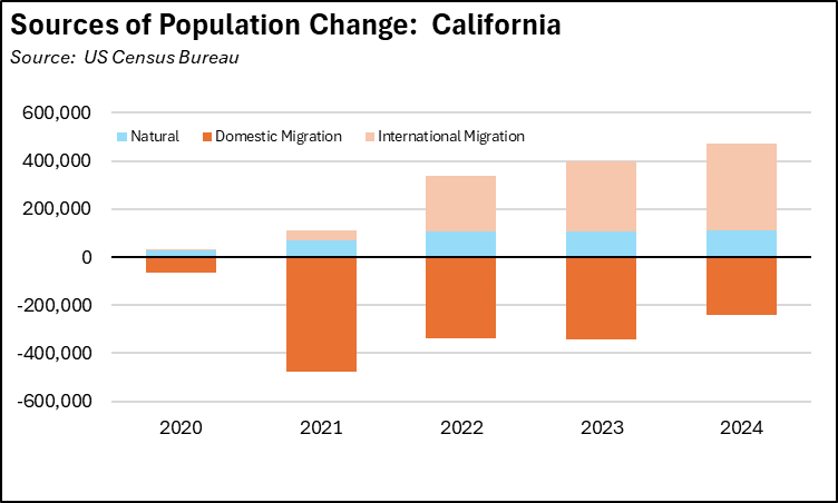 California continued to show a net outflow from domestic migration, with 239,600 more people leaving the state than moving here. This level was down somewhat from the 2023 outflow of 344,000.