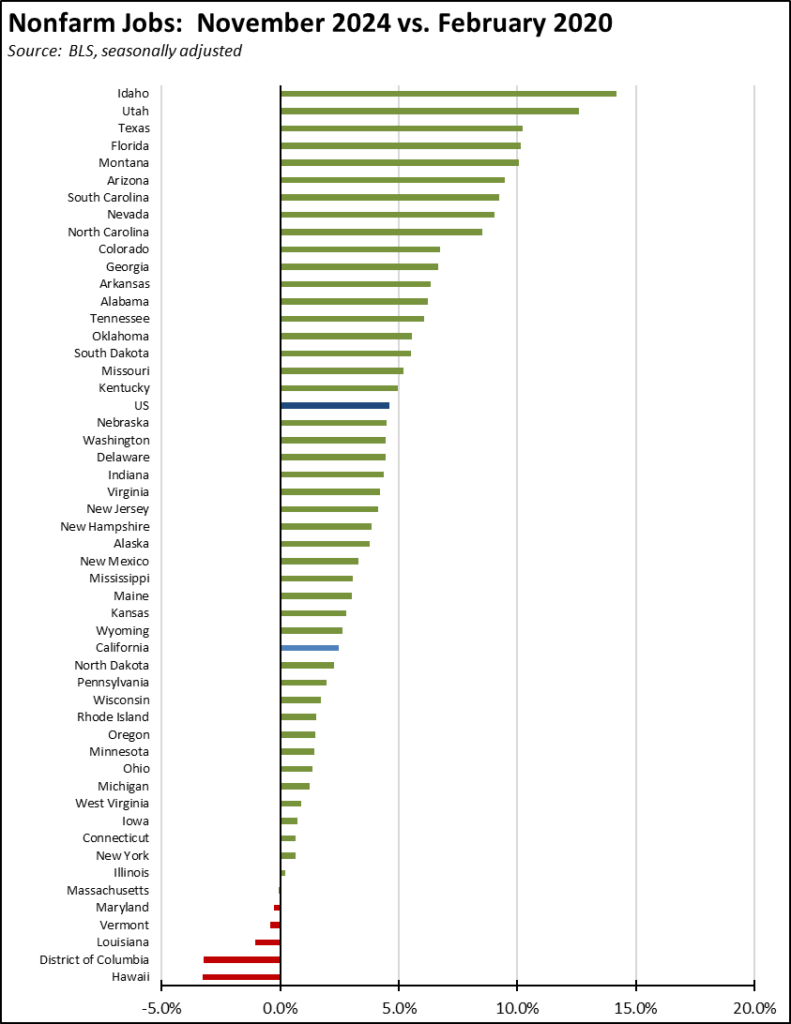 Compared to the pre-pandemic peak in February 2020, California’s relative ranking for employment recovery remained at 5th lowest among the states and DC.
