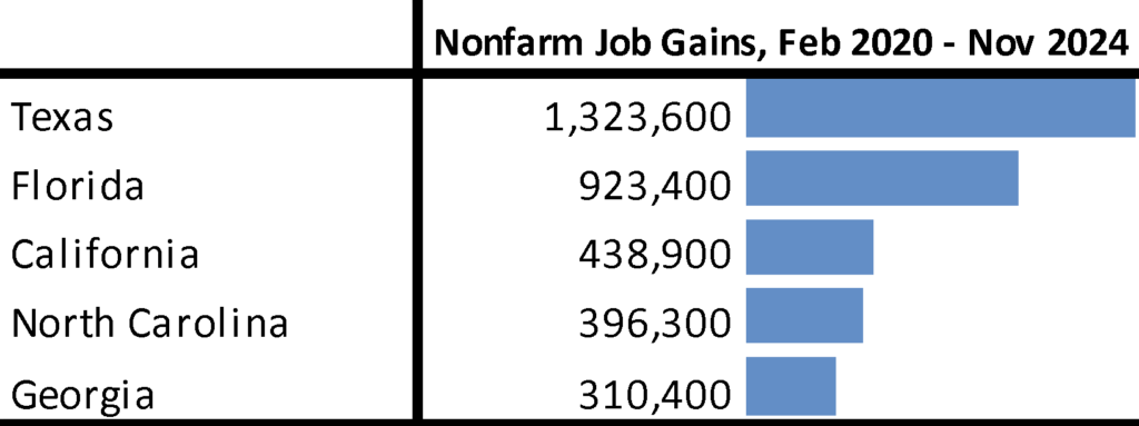 Compared to the pre-pandemic peak, California has now gained a net 438,900 nonfarm jobs, remaining in 3rd place just ahead of much smaller North Carolina.