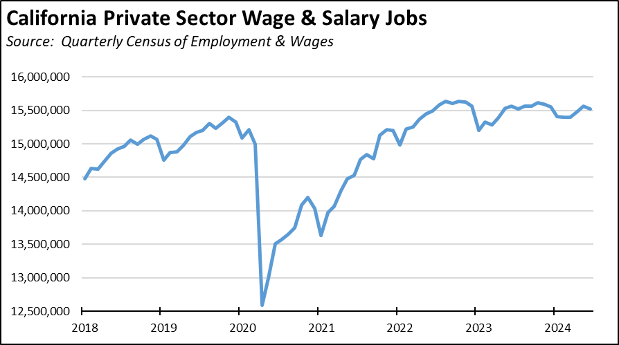 The Governor’s release was correct in stating that “Private sector jobs are [the] backbone of California’s job growth,” but the reality is that those jobs have stalled and are now in decline. Job growth instead has been coming solely from expansion of government jobs and government supported jobs in Healthcare & Social Assistance. As the essential revenue base shrinks along with the private jobs base supporting it, even that growth comes into question.