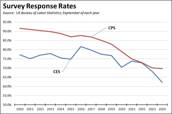 An additional issue with the current surveys used to produce the monthly estimates is that fewer businesses and people are responding. The monthly estimates come from two surveys. The establishment survey (CES) is used to develop the monthly wage and salary job estimates. The household survey (CPS) is used to craft the labor force estimates. Both saw a sharp drop in response rates during the pandemic, but both also have experienced a longer trend eroding their overall response rates. Looking at the September results over the years, the most recent CES survey response rate of 62.2% (first preliminary release) was the lowest since 2002. The CPS response rate of 69.7% was the lowest since at least 1994. Both response rates, however, still produce statistically significant results, but results that may face higher revisions during the annual adjustments especially at the sub-industry level. The annual revisions that bring the monthly estimates in line with the actual job counts from the QCEW data consequently have become more important.