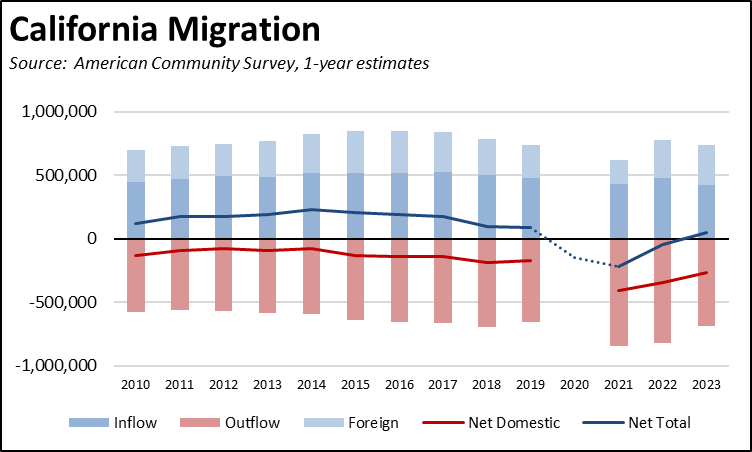 The Census Bureau’s recent state migration numbers from the American Community Survey, 1-year estimates again show more people moved (690,127) from California than came here (422,075) from other states in 2023. The domestic inflow was the lowest in the data series (since 2010), while the outflow was comparable to the level in 2018.