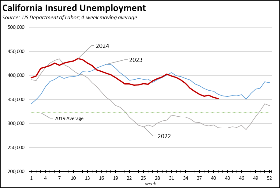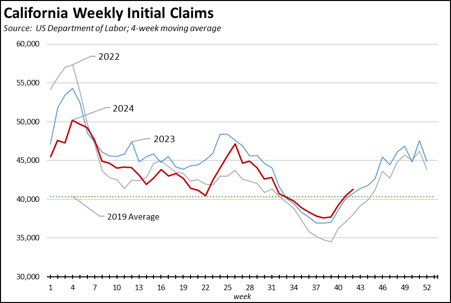 Measured on a 4-week moving average basis for the week ended October 19, the number of initial claims continues to moderate from the sharp rise that began at the beginning of June. The overall trend continues to track just marginally above the results from 2023 during the same period.