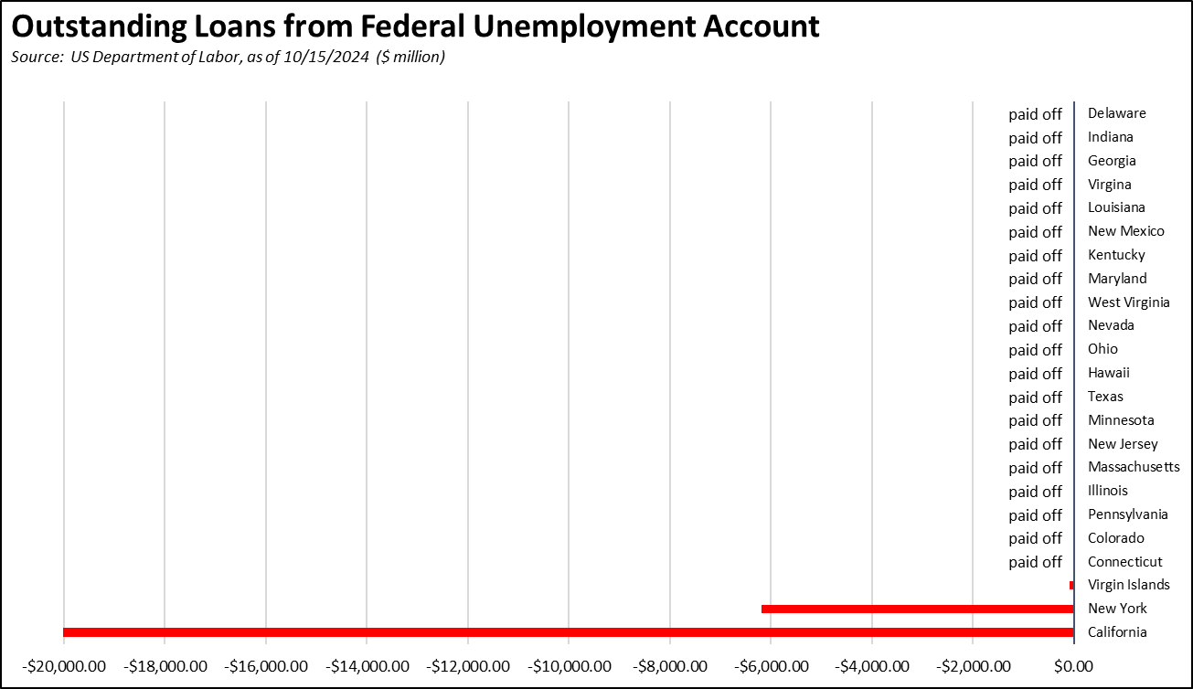 The state’s continuing failure to address its burgeoning Unemployment Insurance debt saw the level growing to $20.4 billion in mid-October. All other states other than New York have paid off their pandemic period debt, in large part using the federal funds provided for that purpose. California instead chose to use those funds on other expenditures.