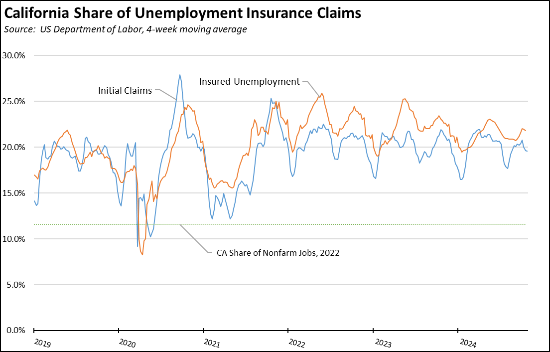 Reflecting California’s outsized share of total benefit payments, insured unemployment was 21.3% of the national total (4-week moving average), while initial claims were 19.5% of the total.
